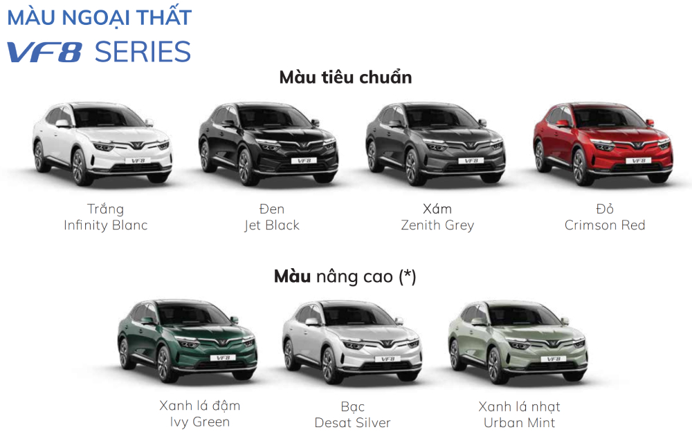 VF 8 thế hệ mới đem đến 7 lựa chọn màu ngoại thất gồm 4 màu tiêu chuẩn và 3 màu nâng cao, phù hợp cho những chủ nhân yêu thích phong cách và sự sang trọng.